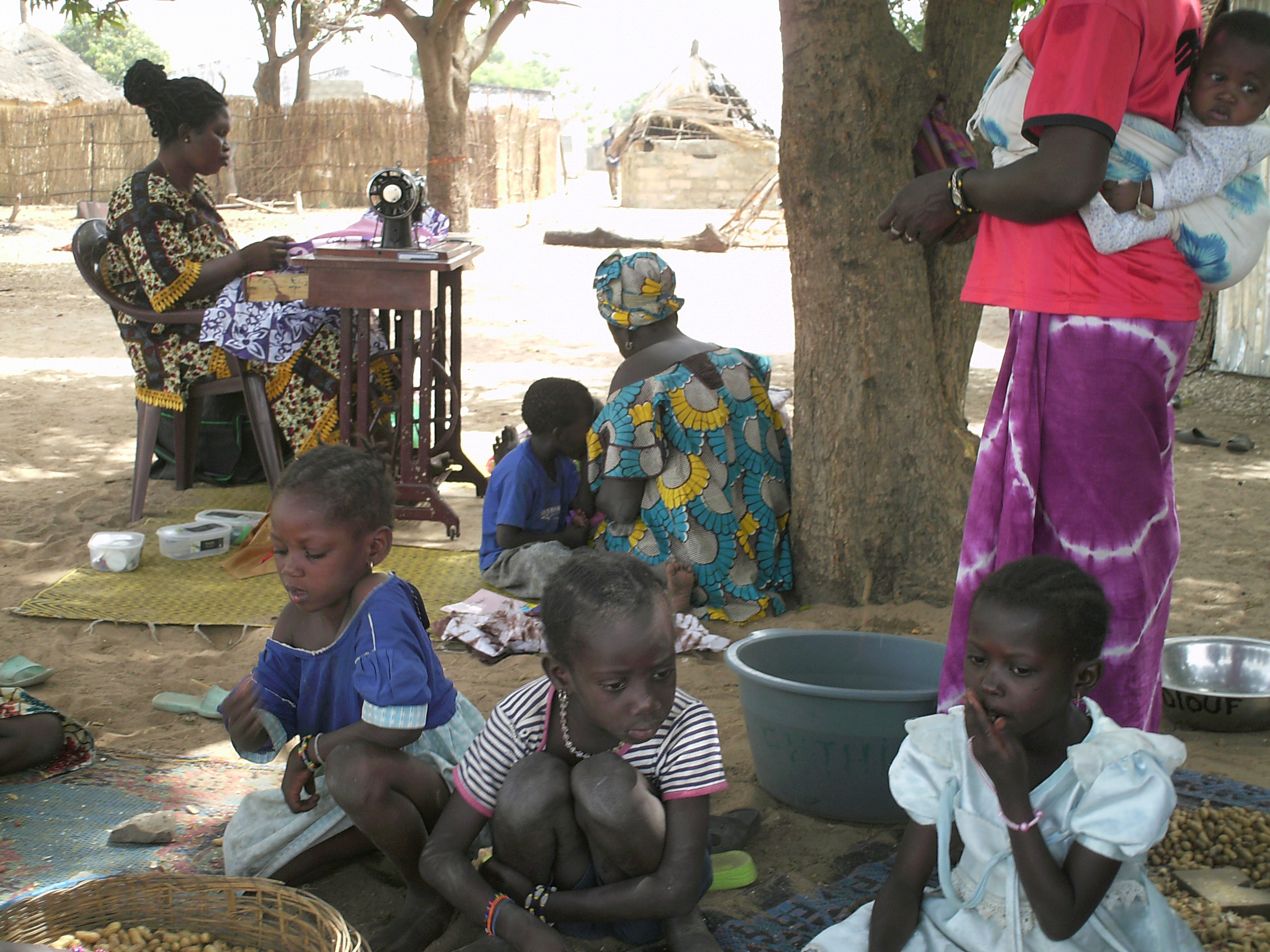 Met wat materiaal uit België en 350 euro van milde schenkers gaan we aan de slag. De hut van Mariama is onze werkkamer. De aanzet is gegeven en dagelijks komen er meer en meer vrouwen werken. De kinderen zitten op moeder’s rug.