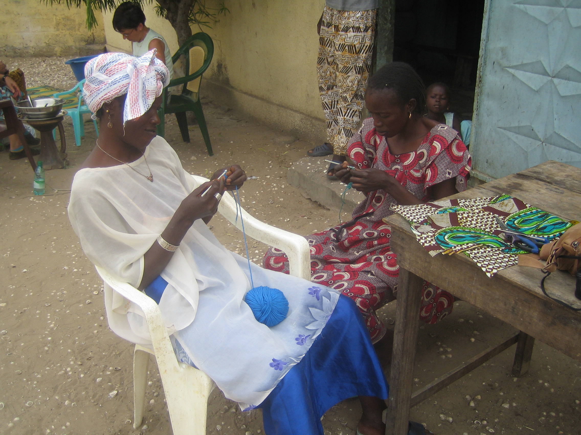 Yolande en Marie Paul gaan mee om te haken en te breien. De vrouwen daar zijn in de wolken. Samen breien we truitjes en haken jasjes voor de vele nieuw pasgeborenen. Er wordt ook geïnvesteerd in een nieuwe naaimachine, zodat de grotere kinderen nieuwe kleedjes krijgen voor het bekende ‘Tabaski’ feest. Een atelier uit stro wordt verwezenlijkt. Nu zijn we tenminste beschermd tegen de hitte en de zon. De gelden komen van familie en vrienden.