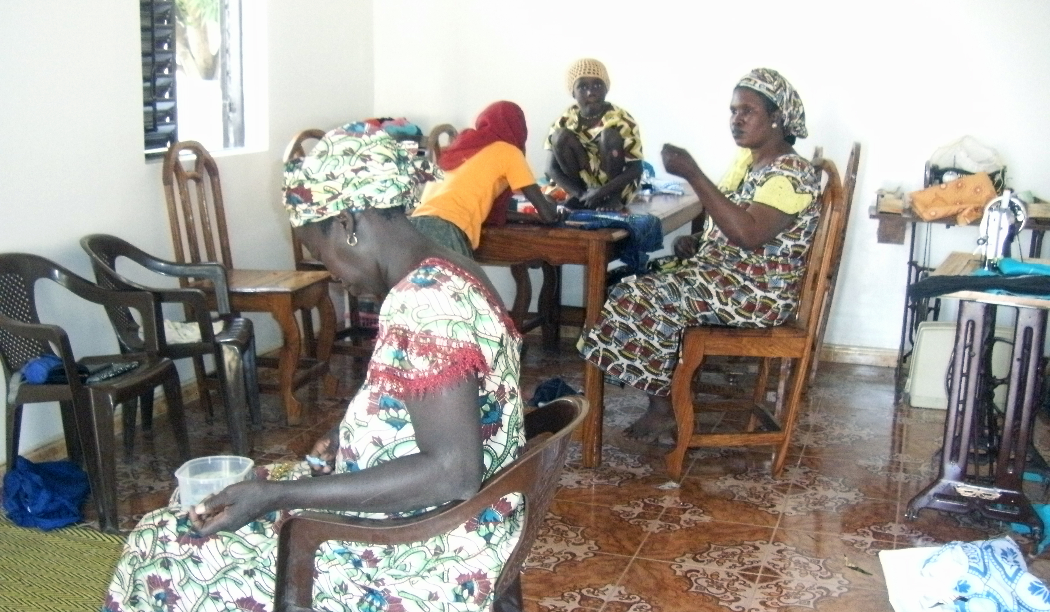 Een aantal mannen en vrouwen van het dorp Bambougar werkten in een plaatselijk hotel, dat eigendom was van een frans koppel. We maakten er kennis met Mariama Ndacou Thiare. Samen met haar en nog zes andere jonge zwarte madammen gingen we er aan de slag in de bijkeuken van het hotel. In de kelder van het hotel vonden we een oude naaimachine, een berg stof en een zak wol.